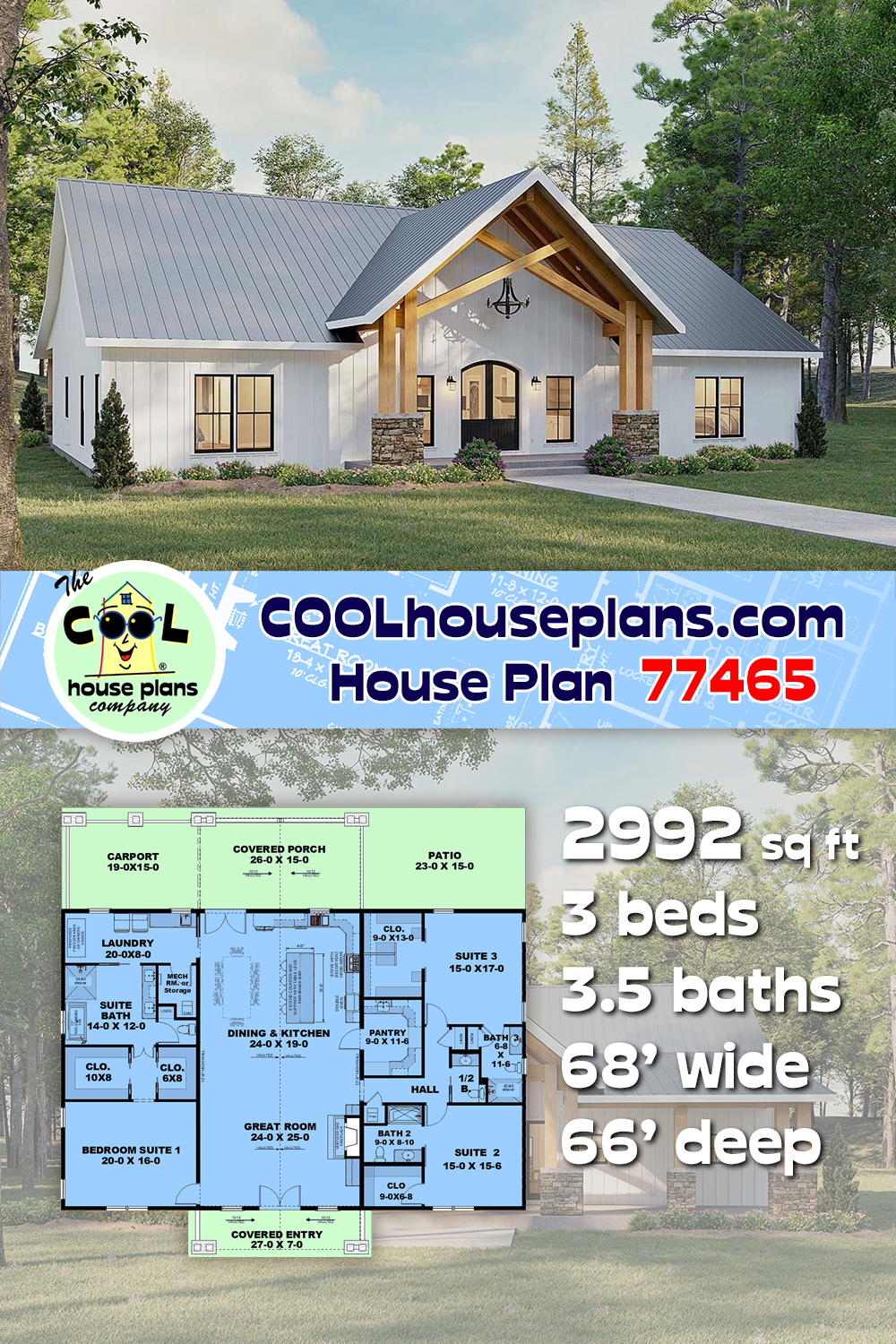 House Plan 77465 - Farmhouse Style with 2992 Sq Ft, 3 Bed, 3 Bath | COOLhouseplans.com