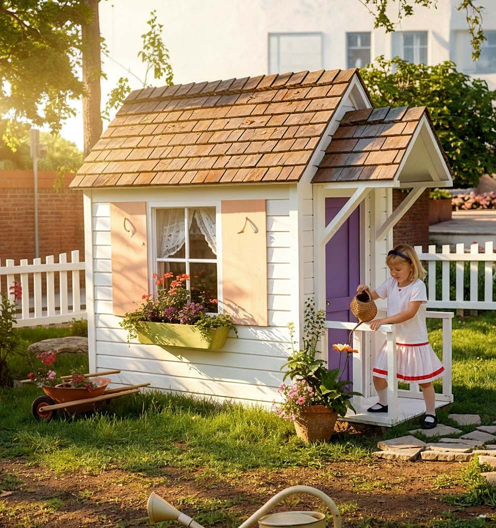 This miniature house was inspired by the cover illustrations from Better Homes and Gardens magazine's April 1930 issue. The tiny house measures just 4'0" x 8'0" x 7'8" tall, including the porch, and is easy to build from common materials. The playhouse is framed with 2x4s, asphalt shingles cover the roof, and the exterior is clad with everyday lap siding.
