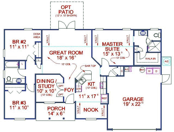 Great split bedroom plan with good traffic pattern and has an optional 4th bedroom. Can also be used as a formal living room, dining room or study. Volume ceilings throughout main living areas with optional plant ledges/soffits. Excellent closet storage s