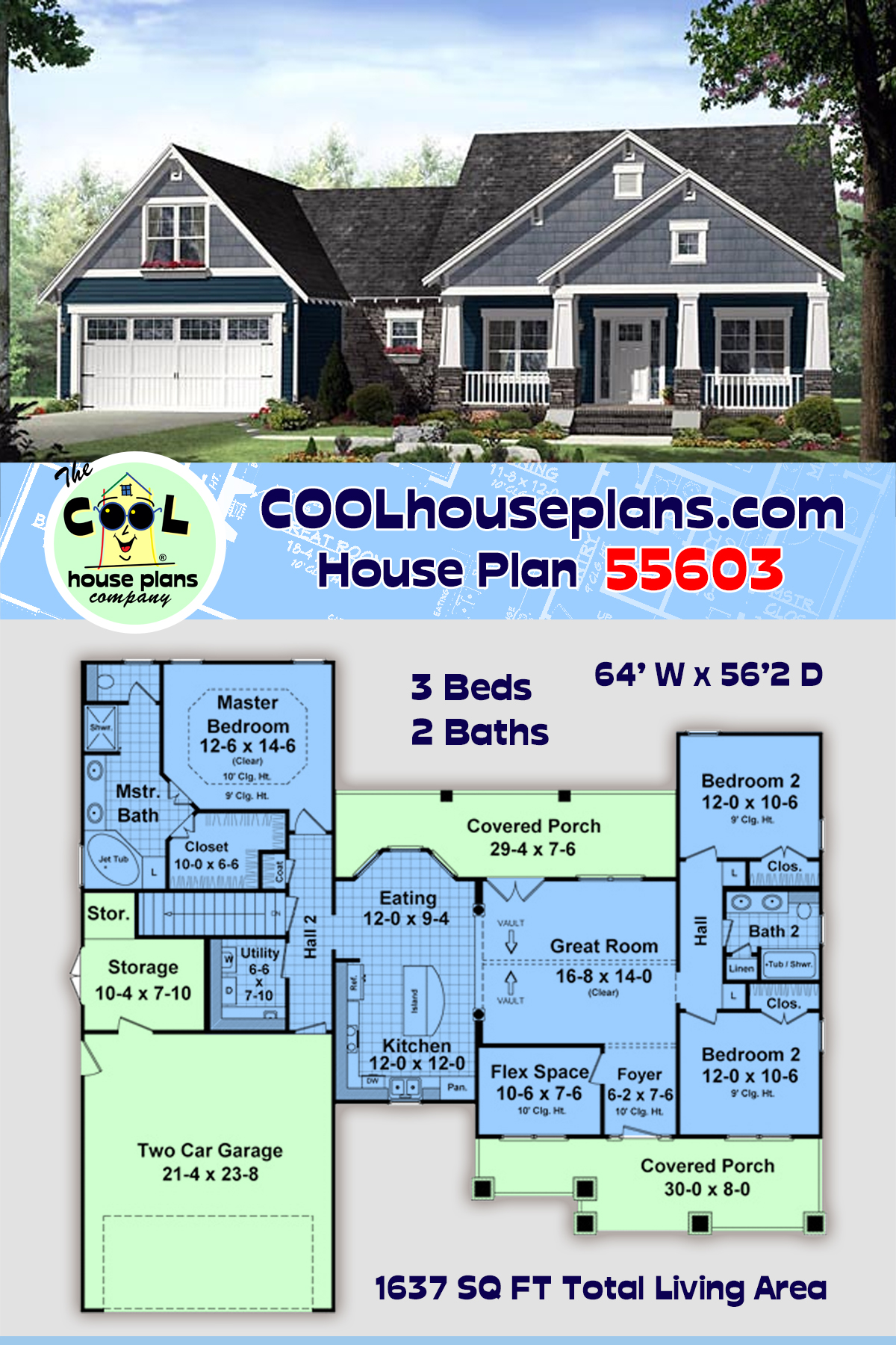 House Plan 55603 - Craftsman Style with 1637 Sq Ft, 3 Bed, 2 Bath | COOLhouseplans.com