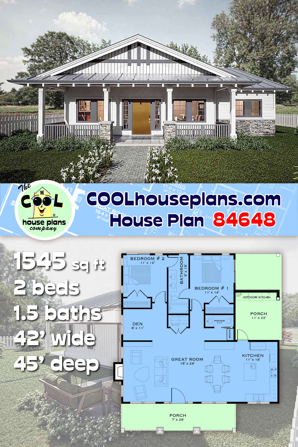 House Plan 84648 - Ranch Style with 1545 Sq Ft, 2 Bed, 1 Bath, 1 | COOLhouseplans.com