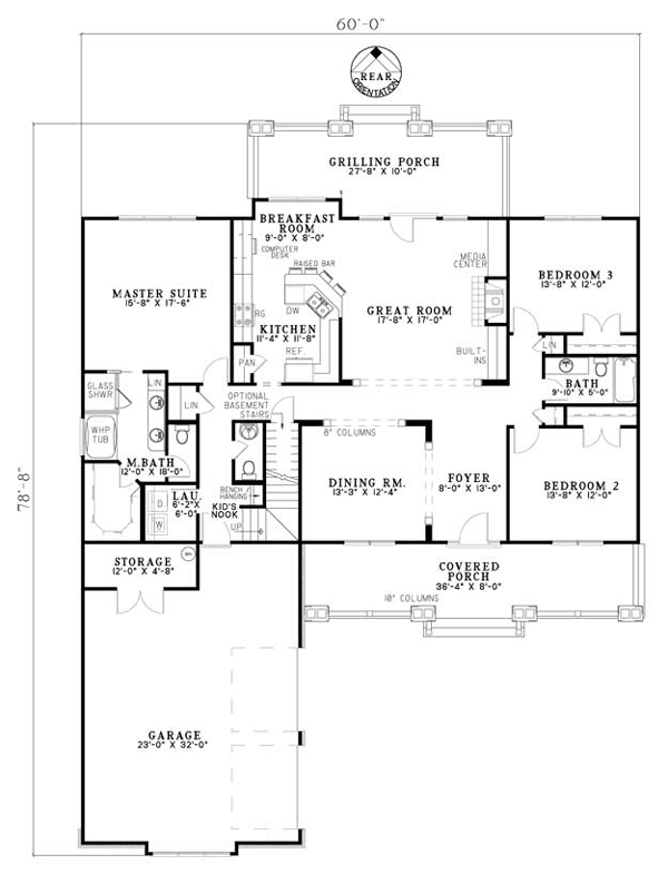 Front Covered Porch with 10 inch columns Open Foyer with 8 inch box columns to Dining Room Great Room with media center, fireplace, built-ins, access to Rear Grilling Porch and open to Kitchen area Kitchen with snack bar and pantry Breakfast Room with Computer Desk Master Suite with private bath Master Bath with glass shower, whirlpool tub, split vanities and walk-in closet Laundry with Kid's Nook nearby Upper Floor Bedroom 4 with walkin closet and desk TV Room Future Bonus rooms available